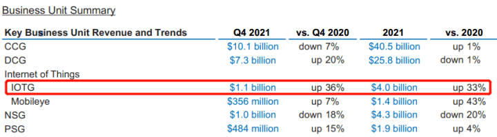 在晶圓代工巨頭臺積電公布的財報中,2021年其手機業務營收首次被HPC(大型高性能計算)業務超越,面向汽車板塊的營收和訂單需求也猛增。 圖像傳感器芯片設計龍頭韋爾股份最新財報顯示,其半導體業務收入同比增長18%,雖然智能手機CMOS占據營收大頭,但業績增長主要來源于車載CIS與安防CIS,尤其在安防領域實現高達60%的業績增長。 2021年物聯網事業部(IoTG)成為國際半導體巨頭英特爾增長最快的業務,同比增長33%,同時汽車自動駕駛業務也增速驚人,反觀主營PC終端的CCG部門業績僅增1個百分點。