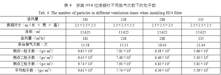 在空調(diào)機(jī)房中新建了三間2.5m×2.5m×2.5m的潔凈間,從空調(diào)主風(fēng)管引風(fēng),每支支管設(shè)置調(diào)節(jié) 閥,并設(shè)排風(fēng)機(jī)進(jìn)行全排,送回風(fēng)口及測(cè)點(diǎn)布置分別如圖 3(每點(diǎn)取樣三次,取平均值)。考慮到初中效過濾器對(duì)最后潔凈度的影響和最后理論塵埃數(shù)量 計(jì)算的方便,試驗(yàn)用初中效繼續(xù)分別為G4、F8,三個(gè)房間分別安裝高效過濾器,風(fēng)量500m3/h,第一組數(shù)據(jù)為送風(fēng)量按GMP 驗(yàn)證指南推薦換氣次數(shù)保持不變,分別用H12、H13、H14、U15過濾器,第二組數(shù)據(jù)為采用H13高效過濾器,調(diào)節(jié)風(fēng)量 ;第三組數(shù)據(jù)為采用H14高效過濾器,調(diào)節(jié)風(fēng)量,分別測(cè)得塵埃粒子數(shù),并列表得出不同的換氣次數(shù)下對(duì)應(yīng)的塵埃數(shù)如表2、表3、表4。